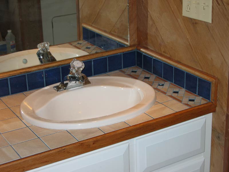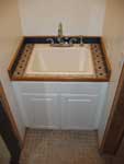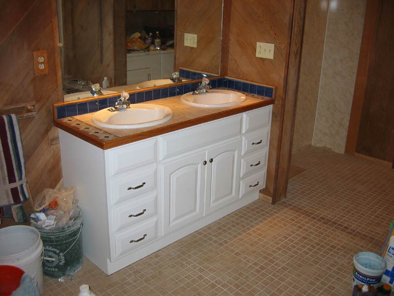 This is the new bath vanity. Again, we made a tile countertop and, like the original, we used two sinks.