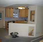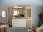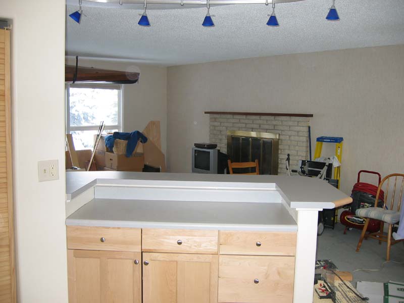 Here is a detail of the breakfast bar looking into the living and dining room. New carpet will be added at a later date.