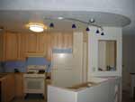 in the kitchen. We were faced with a challenge to provide a transition without remove the acoustic texture in the living and dining room. We've replaced the kitchen lights and added the transformer for the track lighting above the breakfast bar.